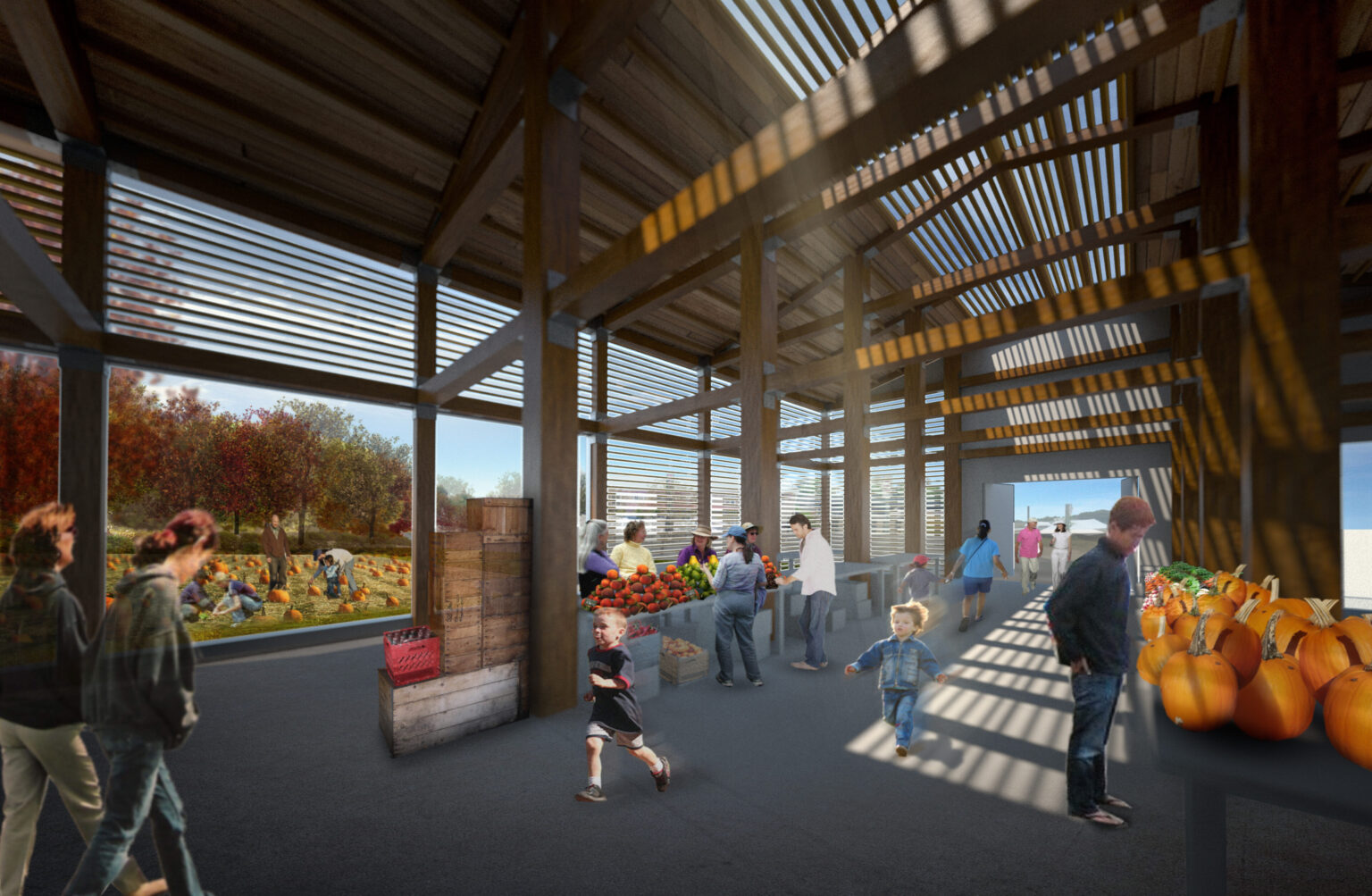 A series of architectural elements reinforce this approach. Green roofs with walk-out gardens extend usable landscape, while a walk-through living wall filters and renews interior air. Sculptural sunshades modulate light and heat, enhancing comfort. Above, the Atmospheric Canopy collects solar energy, provides shade, reflects the surrounding landscape, and channels rainwater for reuse, transforming seasonal change into a visible phenomenon.