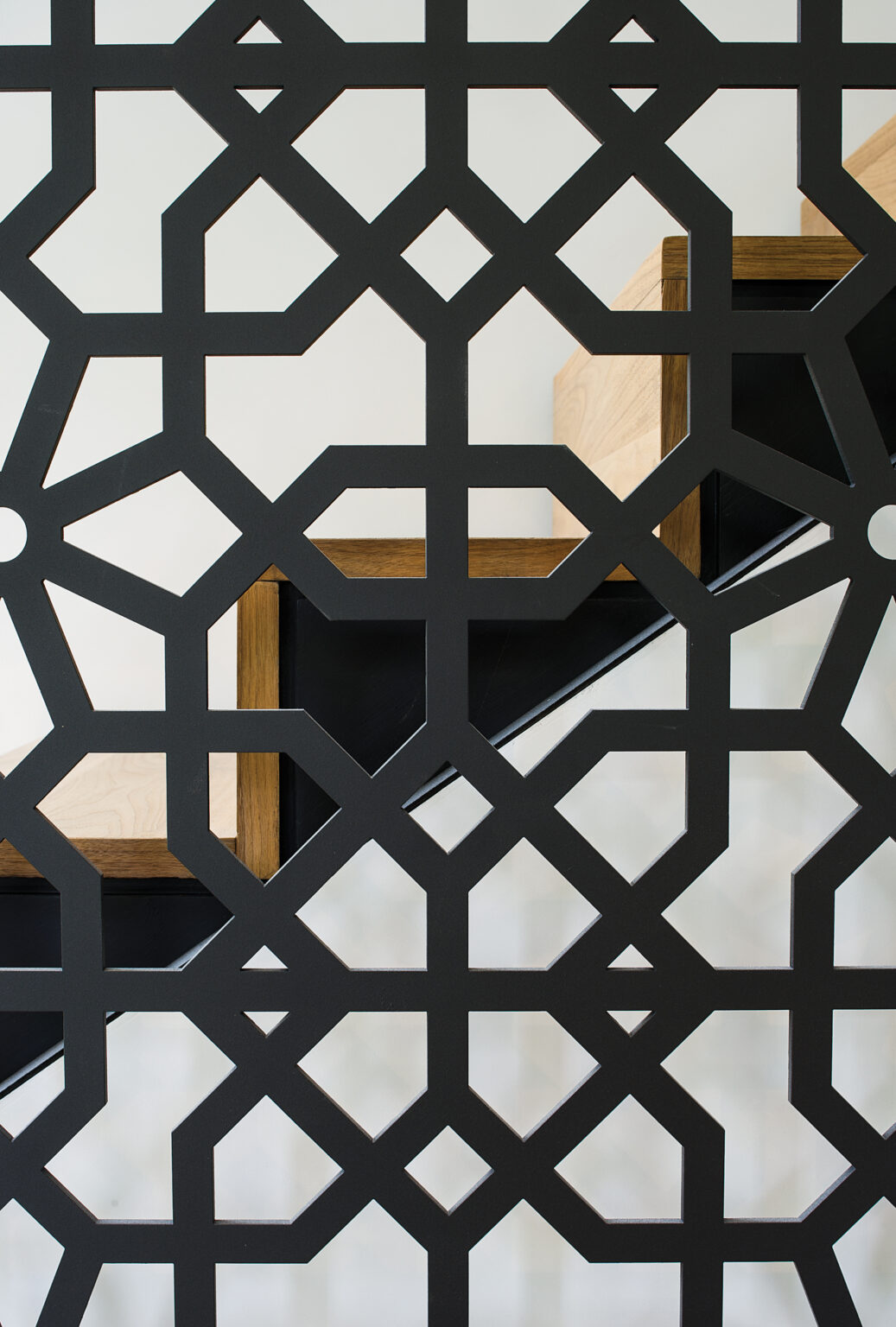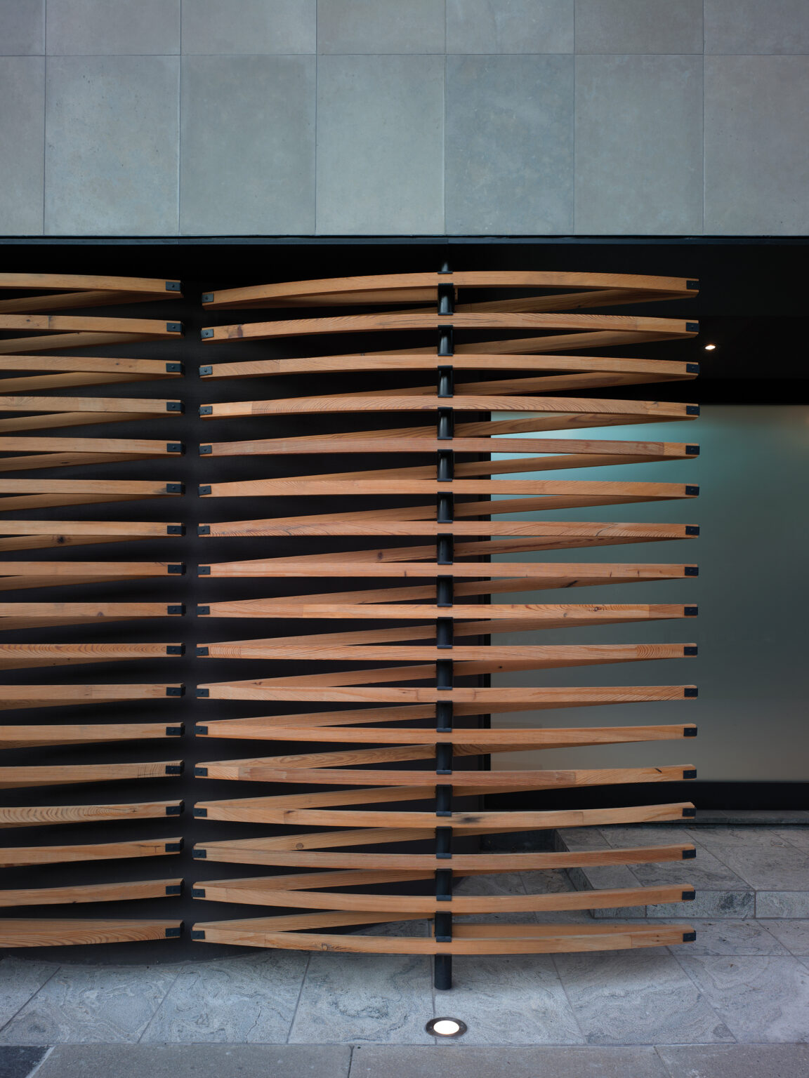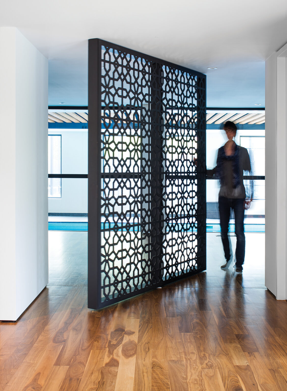 Approaching the house, the front façade is articulated with a long, low limestone wall, with a taller volume of dark raked stucco beyond. Within the frame of the wall, an array of fine wooden screens creates a delicately layered forecourt.