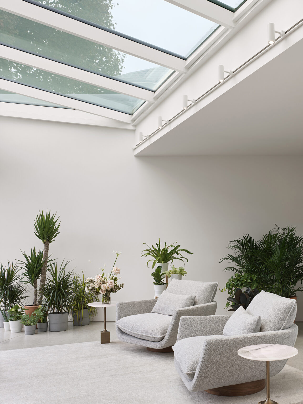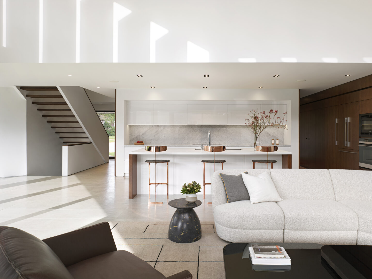 The two-storey interior supports a multi-generational family through a flexible arrangement of shared and private spaces. A central double-height volume opens from the kitchen, allowing daily life to gather in a light-filled space oriented toward the garden and conservatory. The conservatory, defined by a 7.9 metre skylight and large lift-and-slide doors, extends living space outward. Existing trees and a sense of spatial breathing room are preserved, strengthening the relationship between interior spaces and the surrounding landscape.