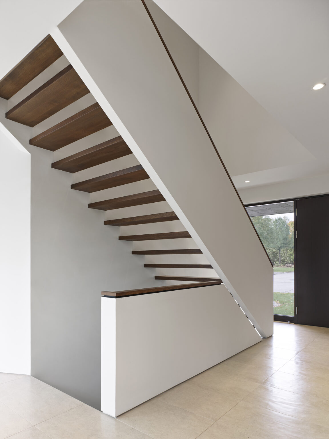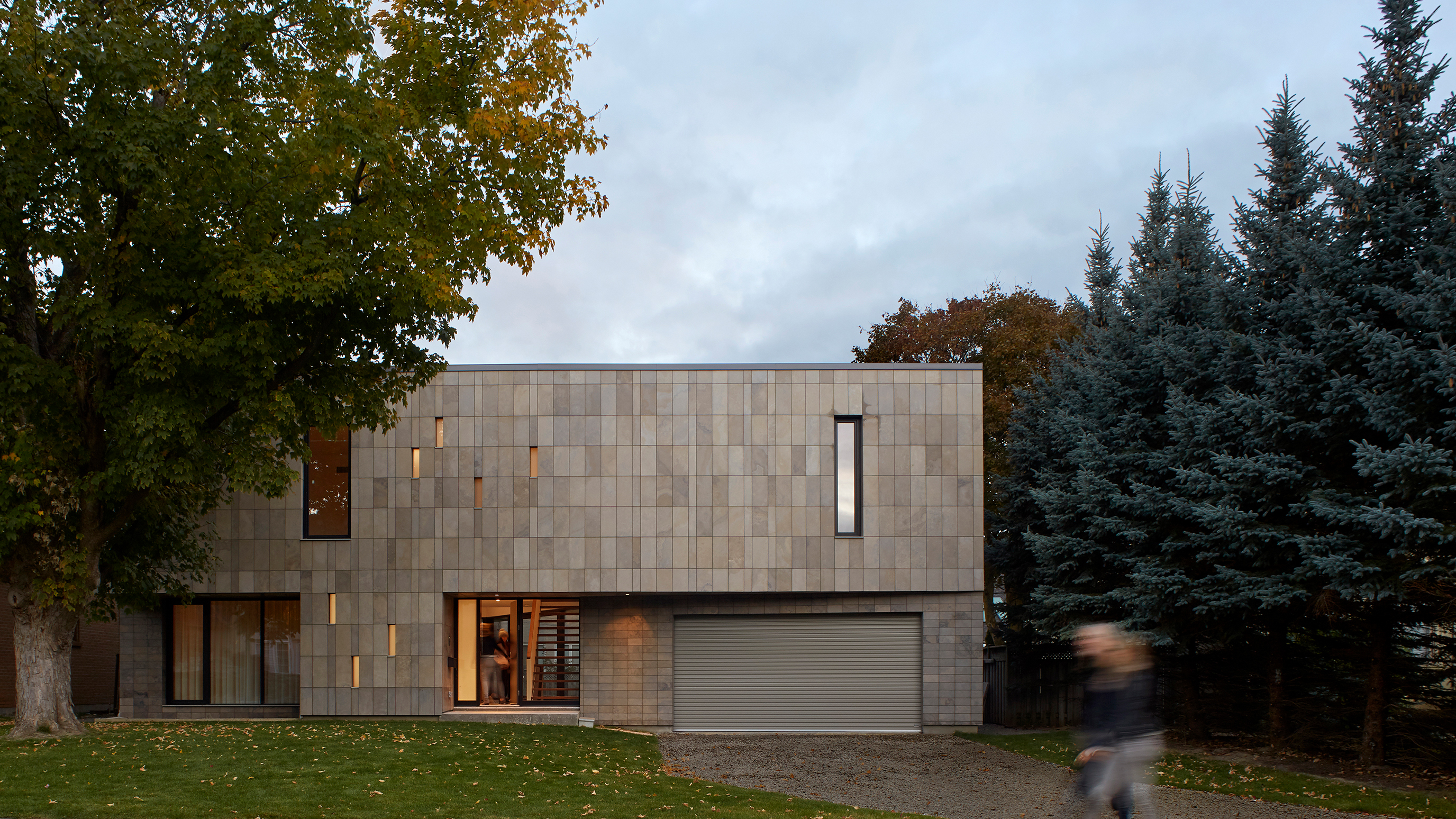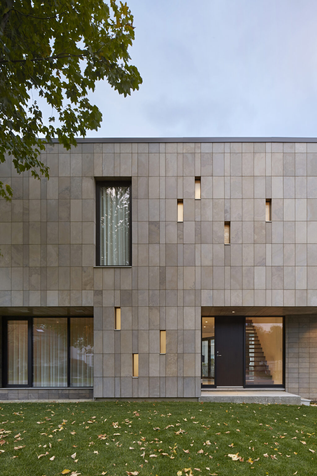 Leacroft House combines bold, modern architectural form with a measured approach to environmental performance, shaped for contemporary family life. Sited within an established streetscape, the house presents an elegant Algonquin limestone facade, composed of honed and polished fleuri-cut panels. The calibrated cladding pattern, shifting from darker to lighter tones across the two-storey volume, establishes a durable and refined street presence while drawing on locally sourced material.