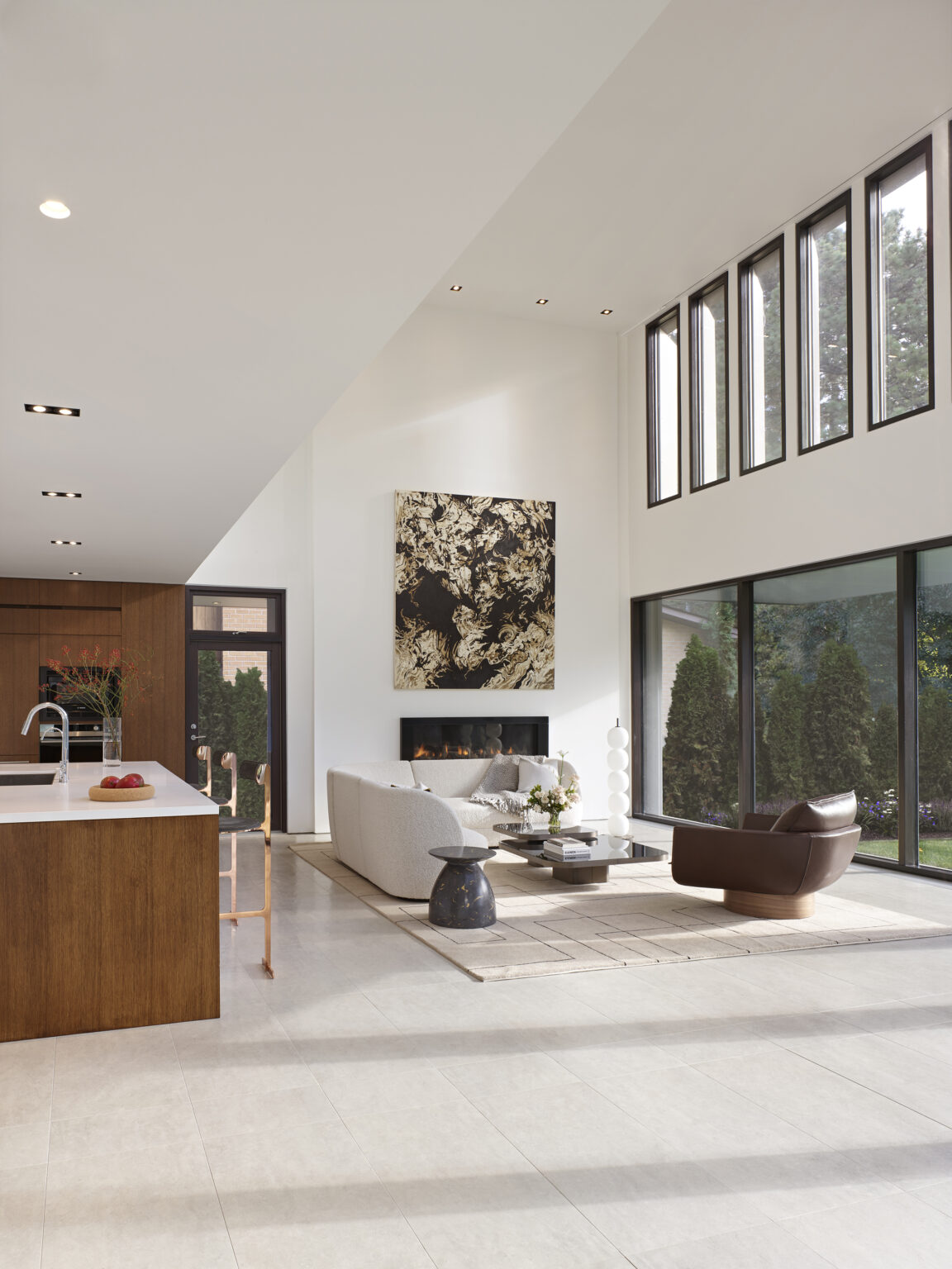 A double-height living space draws in light and landscape, shaping daily life around openness and shared experience.