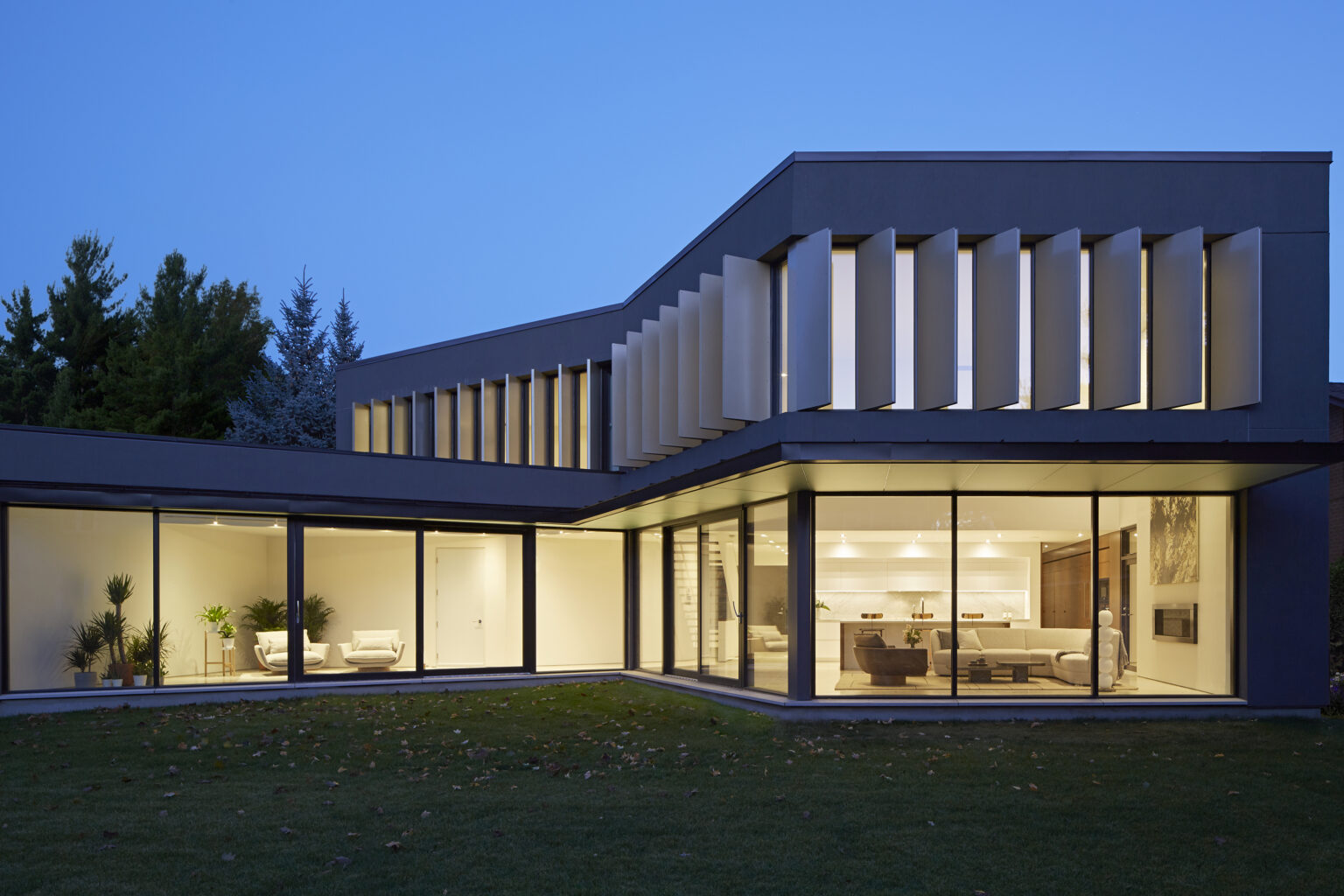Passive solar design informs the building’s form, apertures, and shading devices. At the rear, 26 vertical louvers, each approximately 2.1 metres high, are precisely oriented to the cardinal directions, moderating light and heat gain while maintaining privacy. Combined with a high-performance building envelope and efficient mechanical systems, the house achieves a balance of comfort, durability, and long-term resilience.