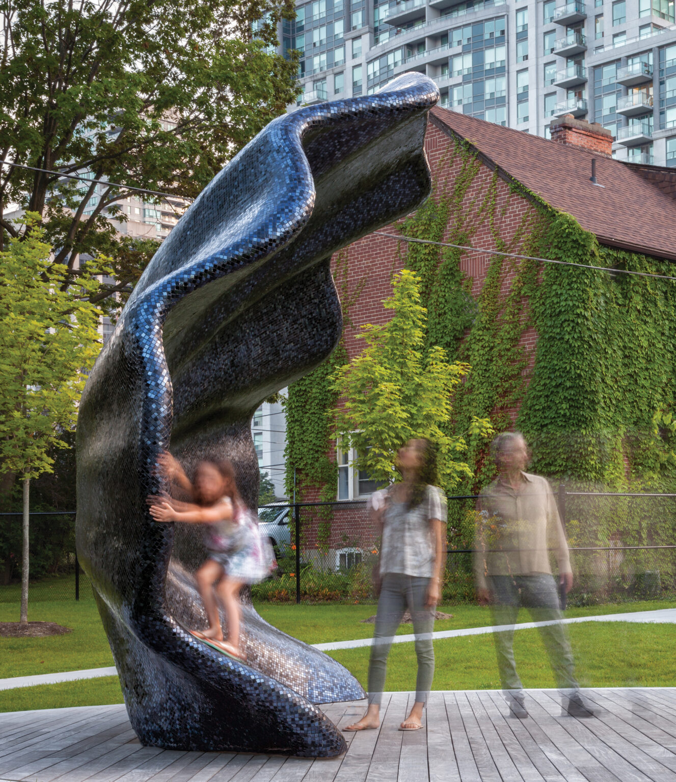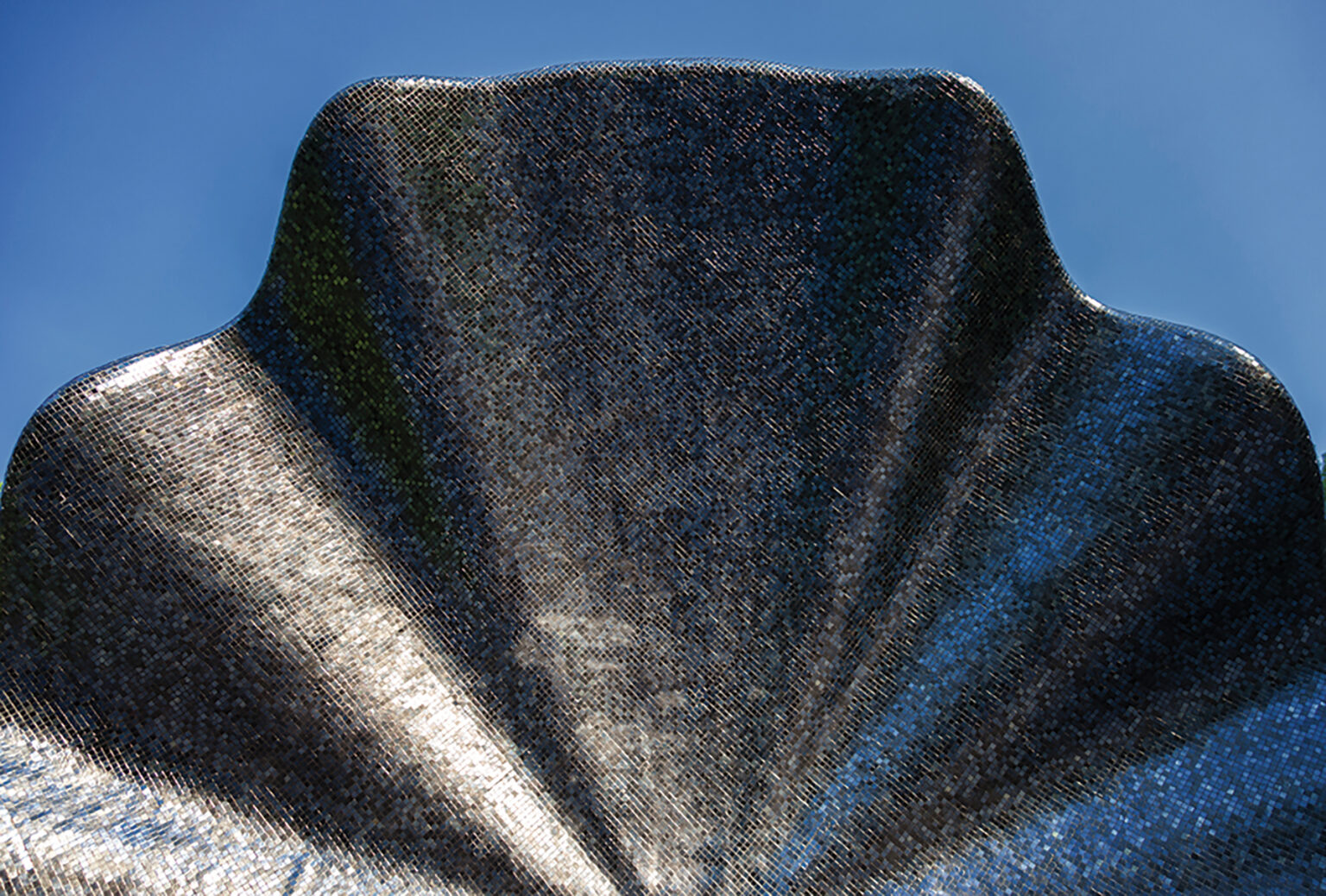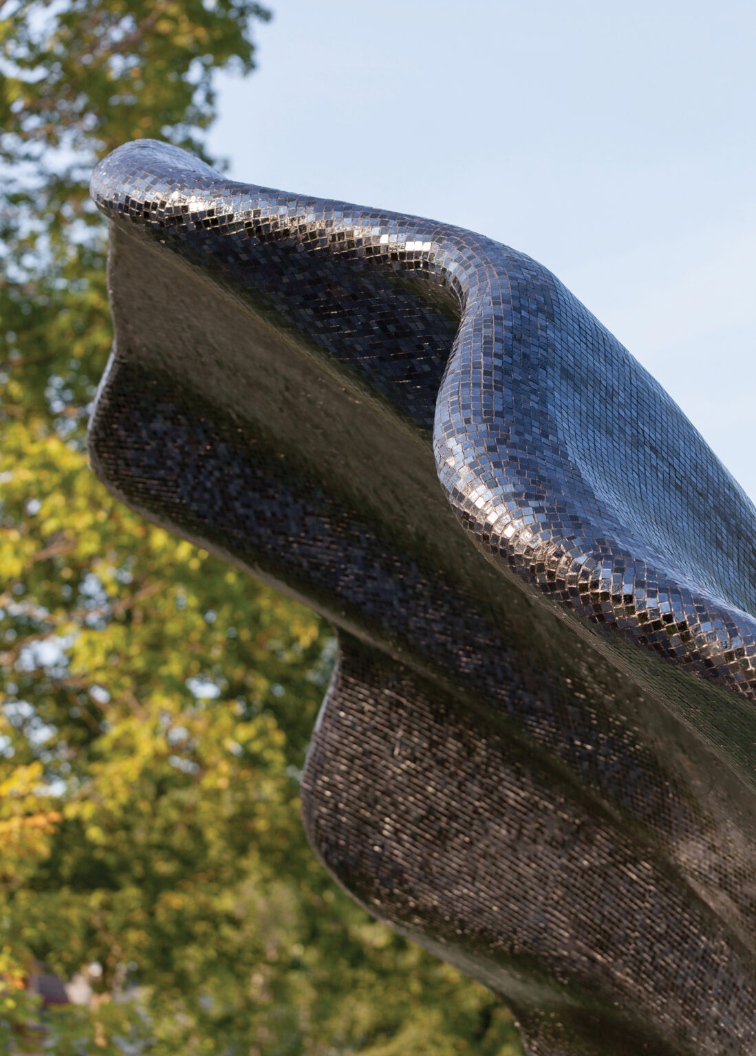 Clad in black glass mosaic, the surface catches light and shadow, giving depth and presence to the bandshell’s form.