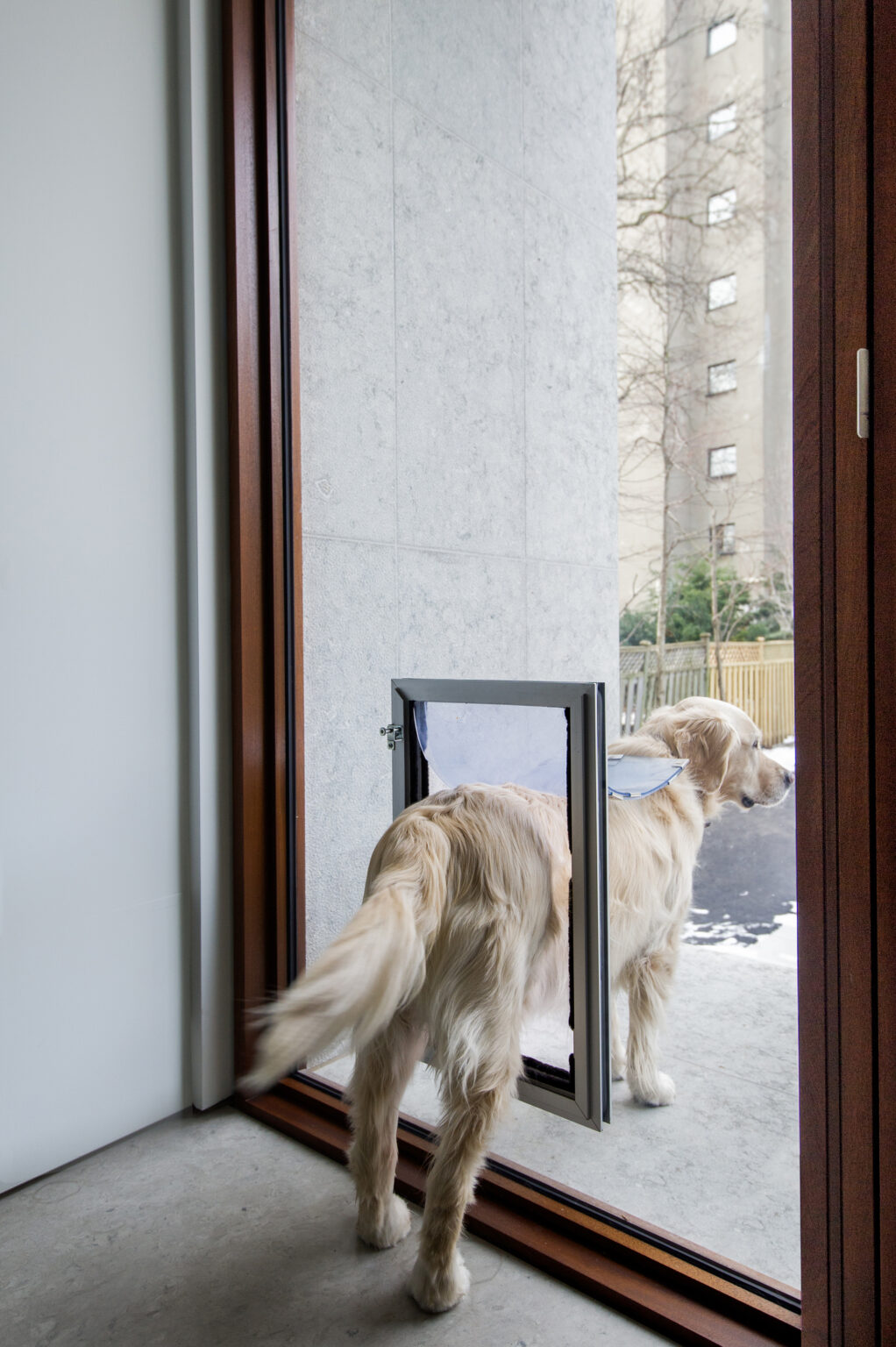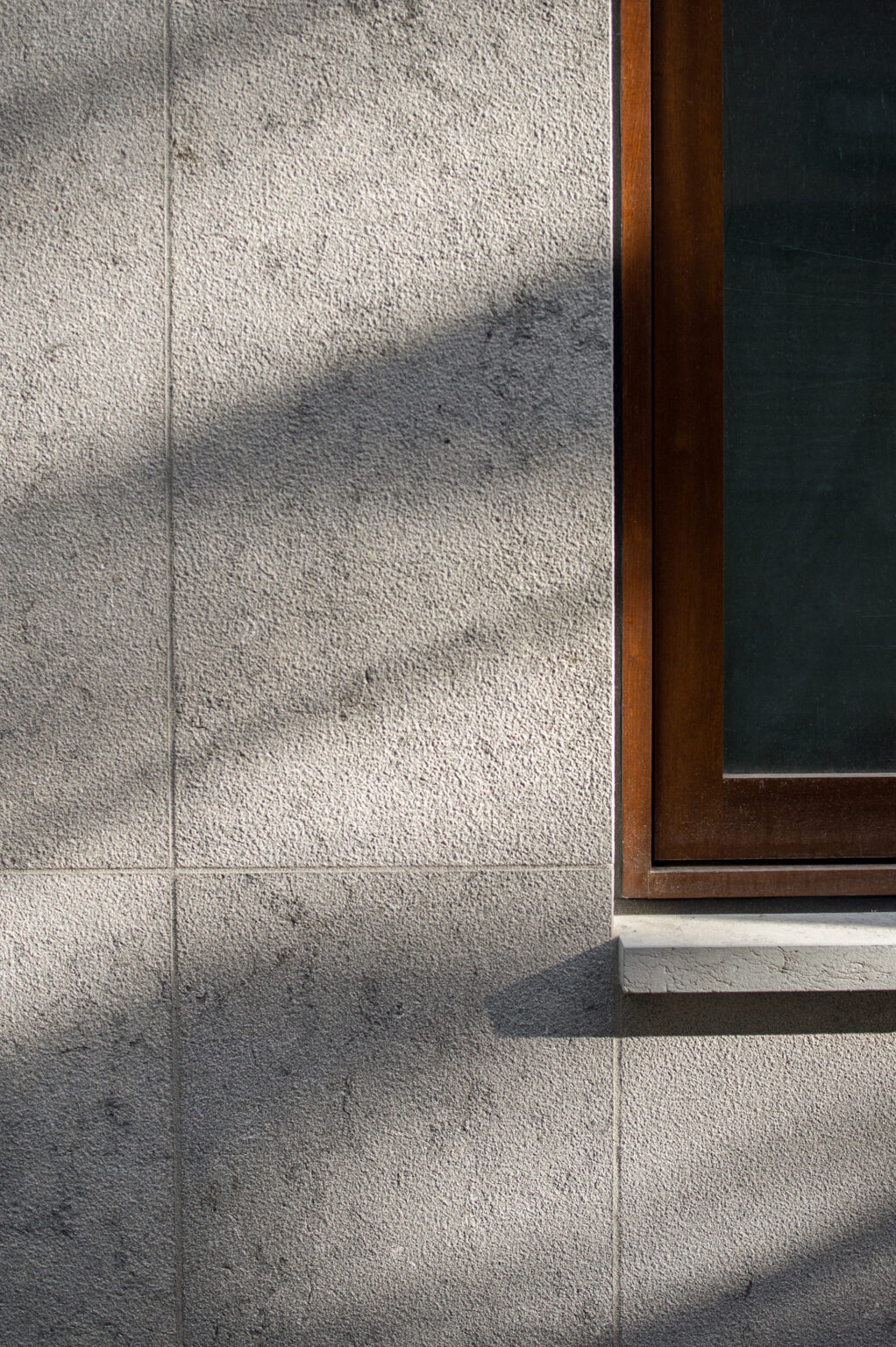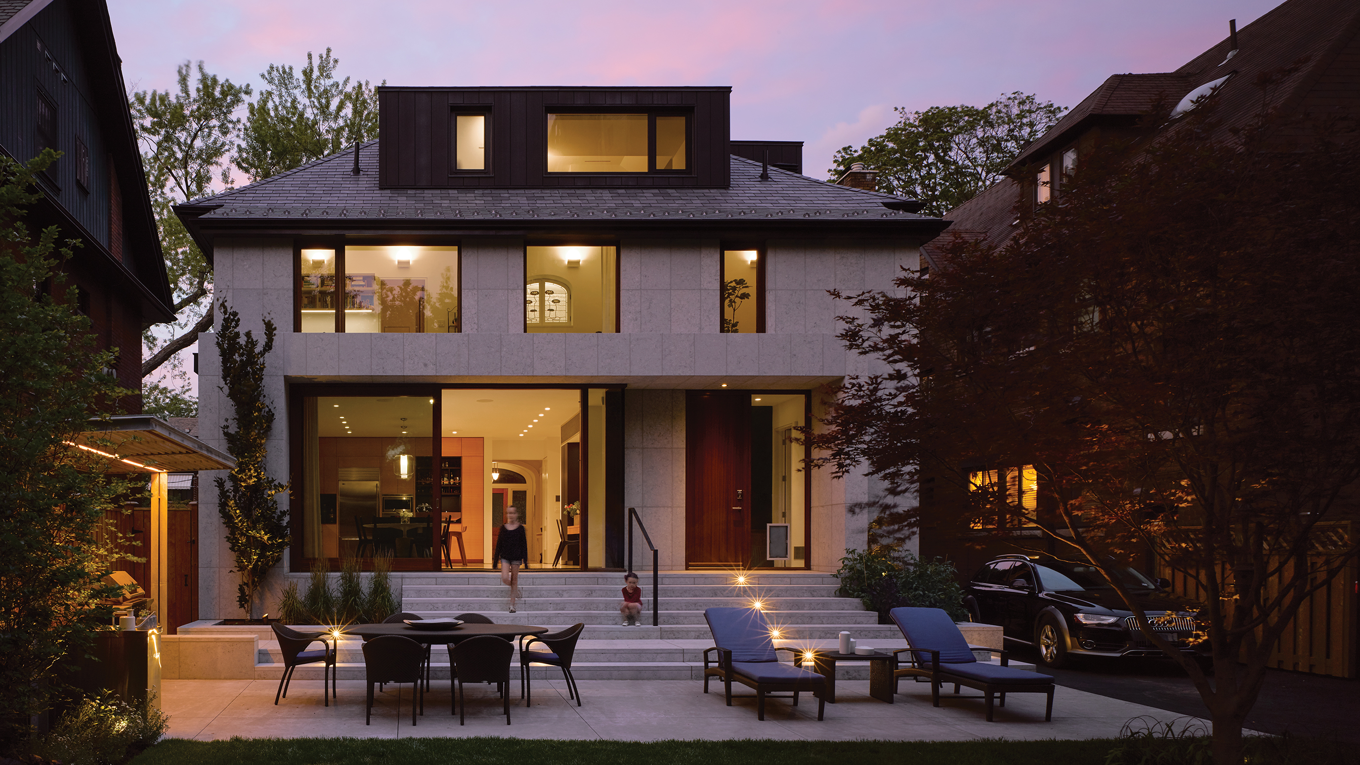 Bush-hammered grey-blue limestone wraps the addition, extending outward to form the rear stair and ground-level patio.