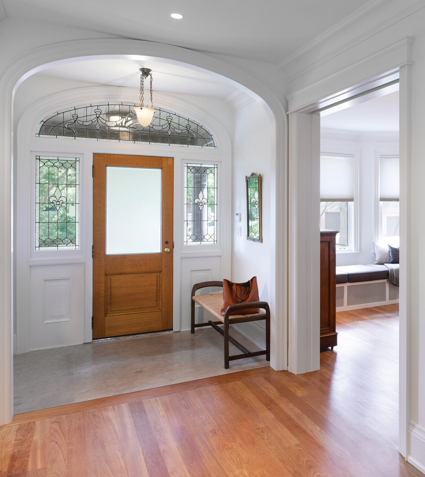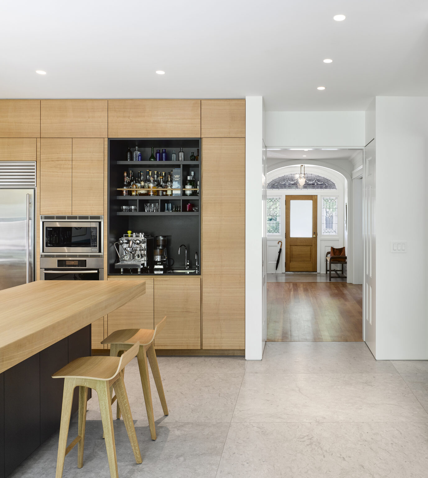 The house unfolds as a measured passage from past to present. A restored exterior preserves the character of the neighbourhood, while the original stained-glass entry opens onto a gracious central hall. From here, the living room, music room, and reconfigured stair retain the scale and proportion of the original architecture, with newly crafted details that quietly reinterpret historic precedent.