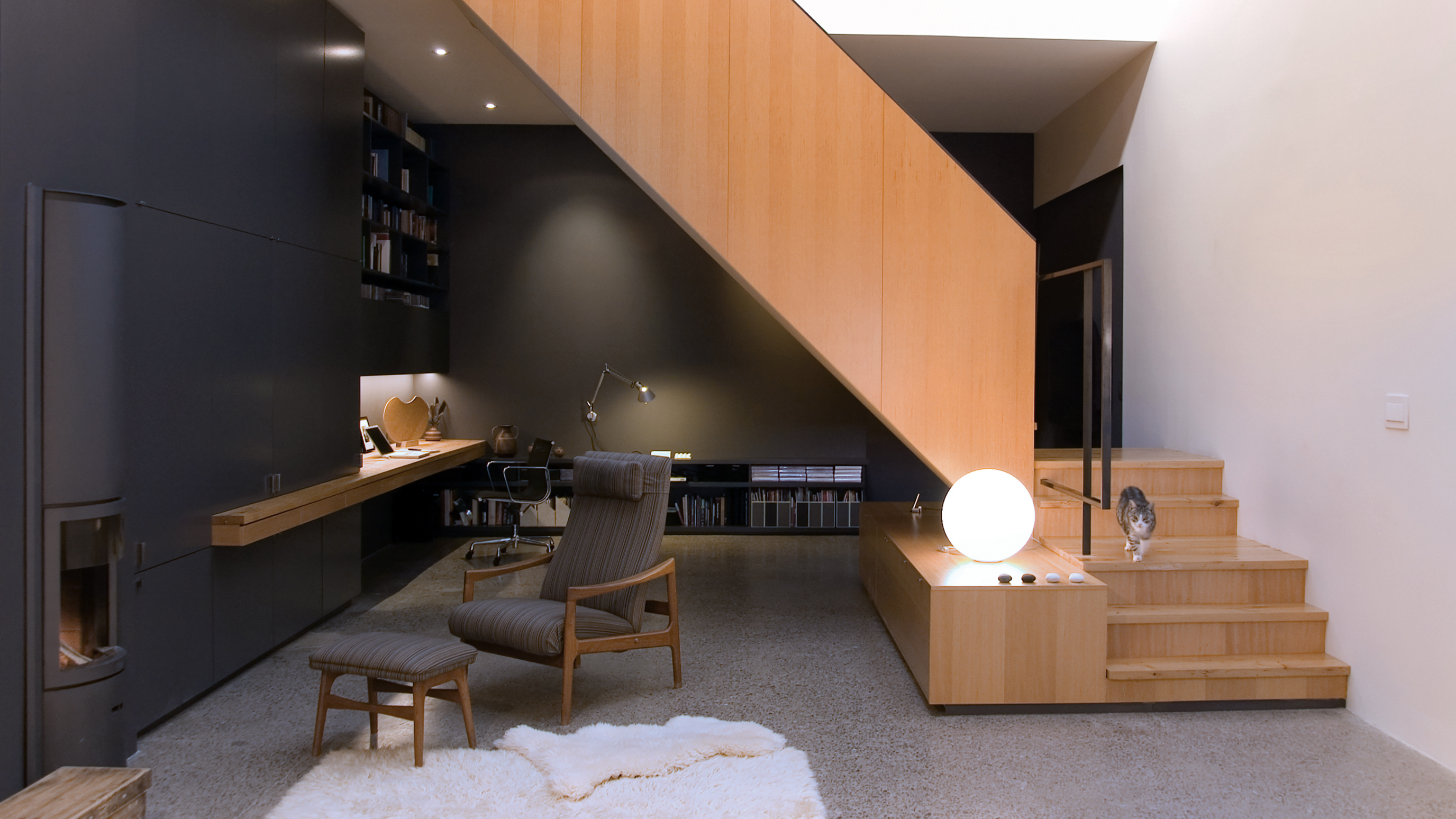 Material continuity reinforces this approach. The original concrete floor and gallery-like white walls are retained, while reclaimed Douglas fir from the existing roof structure is reintroduced as a continuous ribbon through the stair and upper level. A high-efficiency wood-burning stove is integrated within a custom millwork volume, consolidating storage and domestic functions.