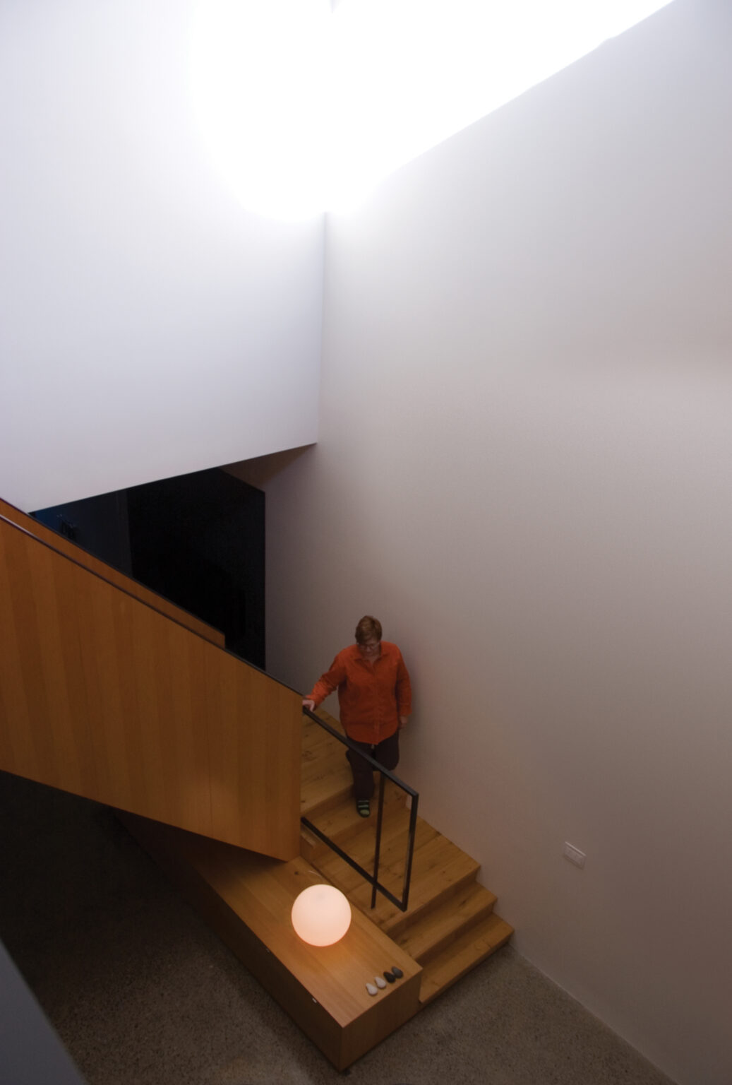 At the centre of the intervention, the roof is opened to create a soaring 12 metre volume. Clerestory windows bring daylight deep into the plan, illuminating what was once a dim interior. Guided by passive solar principles, carefully calibrated overhangs shade south-facing glazing during summer months while allowing solar gain in winter. The triple-height space functions as a thermal chimney, supporting natural ventilation and reducing reliance on mechanical systems.